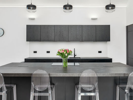 Contemporary kitchen with matt black cabinetry, long island and breakfast seating, stone-effect worktops and layered task/ambient lighting.